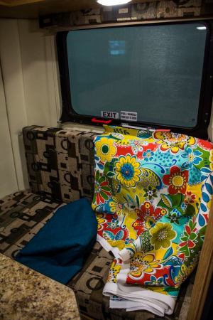 You can see I went quite bold in my choice of fabric for the dinette cushions, but what else would you expect in a Wild Thing!! The solid blue fabric resting on the seat beside the floral print will be used in the narrow window valances throughout the trailer. I think these choices reflect my personality better than the tan and brown standard option that you see in the trailer model. The fabrics are indoor/outdoor weight and should wear well. Luckily, I am a seamstress so I can make a few different sets of cushion covers and change the look of the trailer periodically.