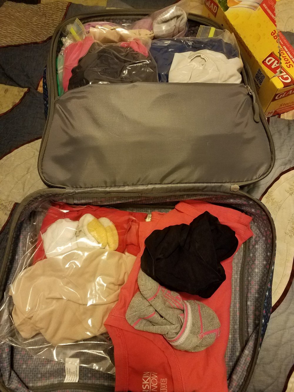I’m packaging several sets of what I call “Fresh Dailies” consisting of a T-Shirt, Socks, and Undies in a ziploc bag. These are the bits of clothing that I want clean every day. The rest of my attire can be worn a couple of days before I need fresh ones. I’ll can just grab one of these Fresh Daily bags when I get to the hotel, pop it into my overnight case, and I’m ready for the night. Easy Peasy! I’m also taking advantage of various sizes of soft sided packing cubes. I don’t want to give up valuable space to luggage!