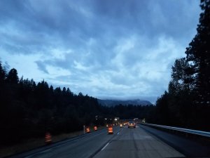 Today was a busy day. I just couldn’t sleep last night. I kept tossing and turning, my mind racing and I found myself waking up every hour. Finally, I gave up at 5 am and got up for good. I was on the road at 6:30 just as the sun was beginning to rise. It was foggy and raining in the higher elevations again today and I90 took me up over the Cascades and through a challenging stretch of road called Snoqualmie Pass.