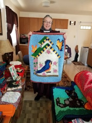 I stayed in the mine for the full hour then followed my new friends Katie, Lisbeth and Darious to the Merry Widow Health Mine Cottage where they are staying. Lisbeth and Katie were offering baked goods, eggs, handcrafts, jams and lotions for sale they made at the Hutterite colony where they live. Both are wonderfully talented. Here is Lisbeth with a rug she created by sewing 1″ squares folded in half to a background marked with a grid. Spectacular!