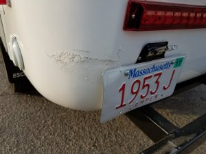 She said she never looked behind her. I would have been hard to miss if she had! She took out the light over the license plate, scraped paint off the bumper, and damaged the fiberglass exterior on the driver side back corner. Thankfully it seems to be superficial damage so as mishaps go this one was minor. It was still pretty upsetting to see my beautiful new baby mistreated! The woman was gracious. Sought me out to tell me about the damage and offered all the right info. I called the police a bit later and they took a report over the phone. Since it was on private property they did not need to respond or file an official report but the Chief of Police called me later in the afternoon and was very helpful and compassionate. He is going to file a report and use the photos I took to make insurance claims easier. My DH was my knight in shining armor as always. He listened to my tale of woe and called Amica, our insurance company for me. Our insurance agent called me back within hours and also assured me that they would cover the damage. After a few private tears of disappointment, I pulled up my big girl panties, dried my eyes and got on with the day.