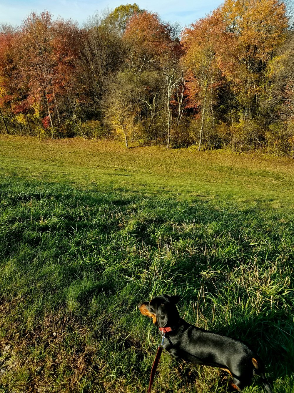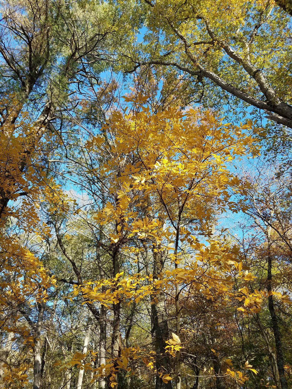 I was happy to see the sun today. After driving to the repair shop and dropping off the parts for Wild Thing, Dexter and I enjoyed a nice long walk in the woods under a robin’s egg blue sky. I enjoyed seeing the variety of colorful leaves scattered on the ground like confetti after a party, listening to the honking of Canadian geese heading south, and smelling the warm damp earth blanketed with pine needles. The air was cool and the humidity low. It was a perfect fall day.