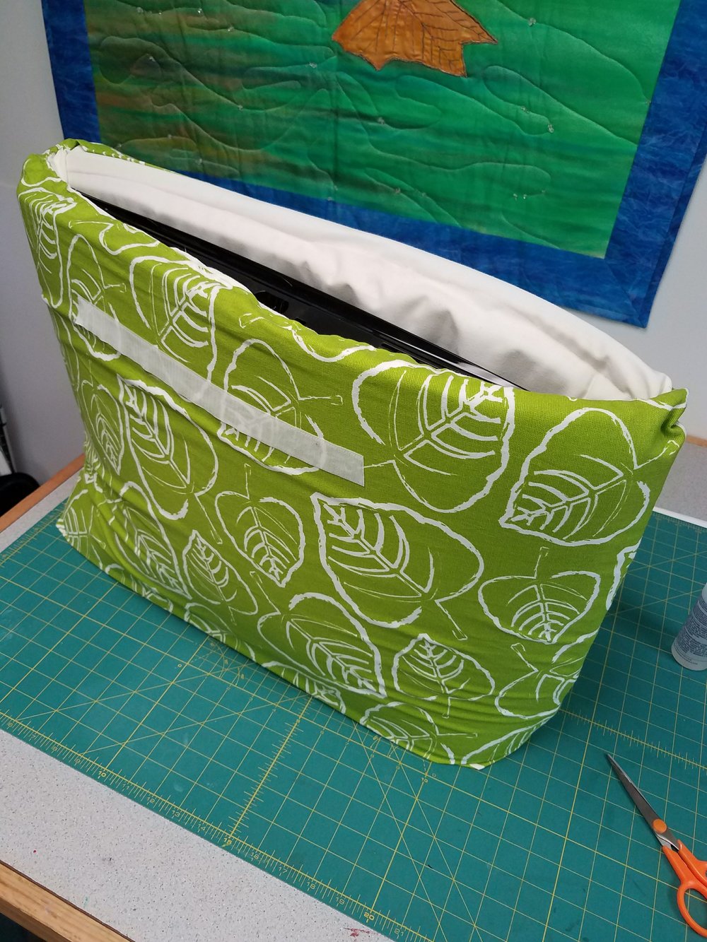 I headed for the studio this morning to sew a storage bag for my camper TV. One of the luxury items in my beautiful new camper is a 24 inch Samsung Smart TV that attaches to the wall between the upper bedroom area and the entryway on a swivel arm, allowing me to view it from either the bed or the main cabin of the camper. When traveling, the TV is removed from the swivel bracket and stowed to prevent damage from bumpy roads. On the maiden voyage with Wild Thing, I didn’t have a good storage solution so I simply tucked it under the covers of the bed when traveling. I wanted a padded case but was unable to find what I wanted in the marketplace, so I decided to make one of my own. I used a drapery weight fabric for the exterior and lined the bag with a heavyweight muslin. I placed 1″ foam padding between the two layers to keep the TV well protected when storing it for travel. It’s not too fancy but is quite functional and I think it’s stylish!