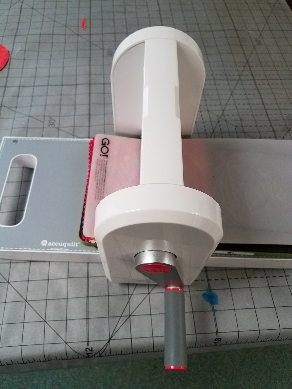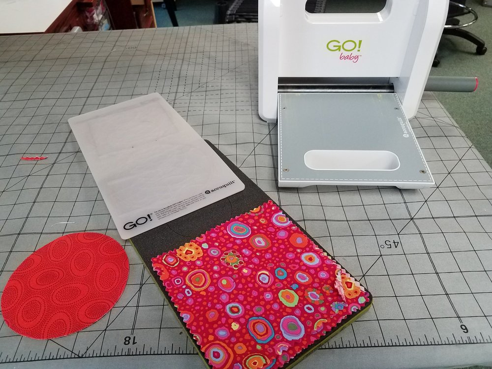 The AccuQuilt Go Baby is easy to use. I rough cut 5 1/2 inch squares of fabric and laid these, four layers thick, on top of the circle die, then covered it with the cutting mat. This sandwich was then fed into the machine as I turned the handle. The die cuts the fabric shape as it passes through the rollers in the center of the unit.