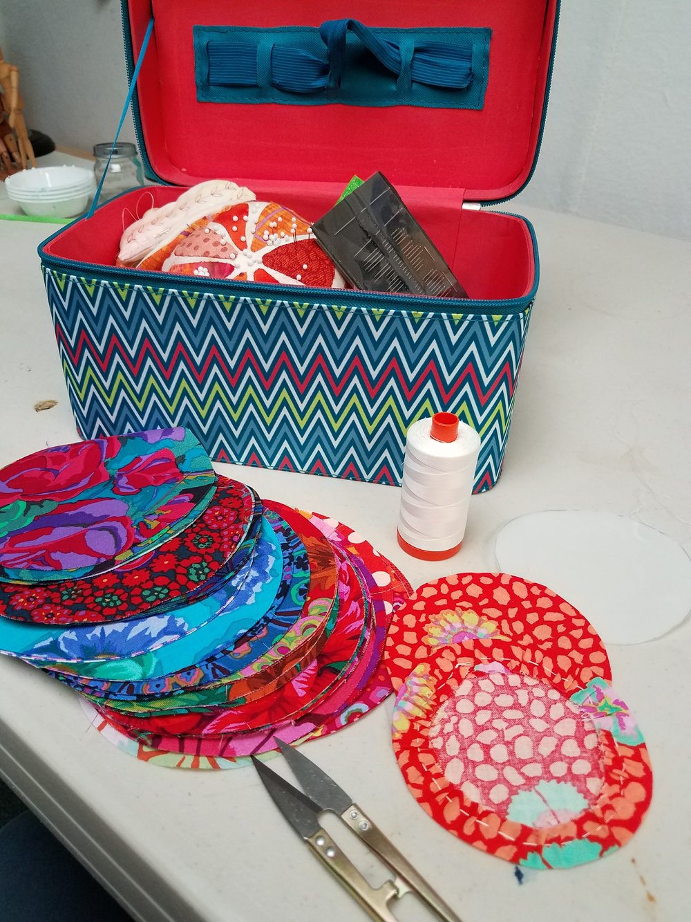 Once the bag was completed I started cutting out circles to be used in my camper quilt. Using my AccuQuilt Go Baby and a 5-inch circle die I was able to cut out a stack of 100 circles in well under an hour, including fabric pressing time!