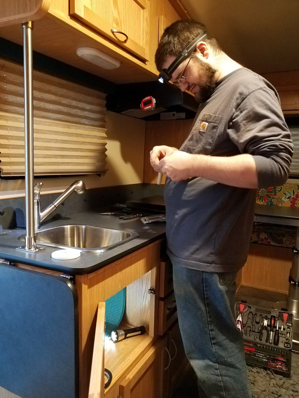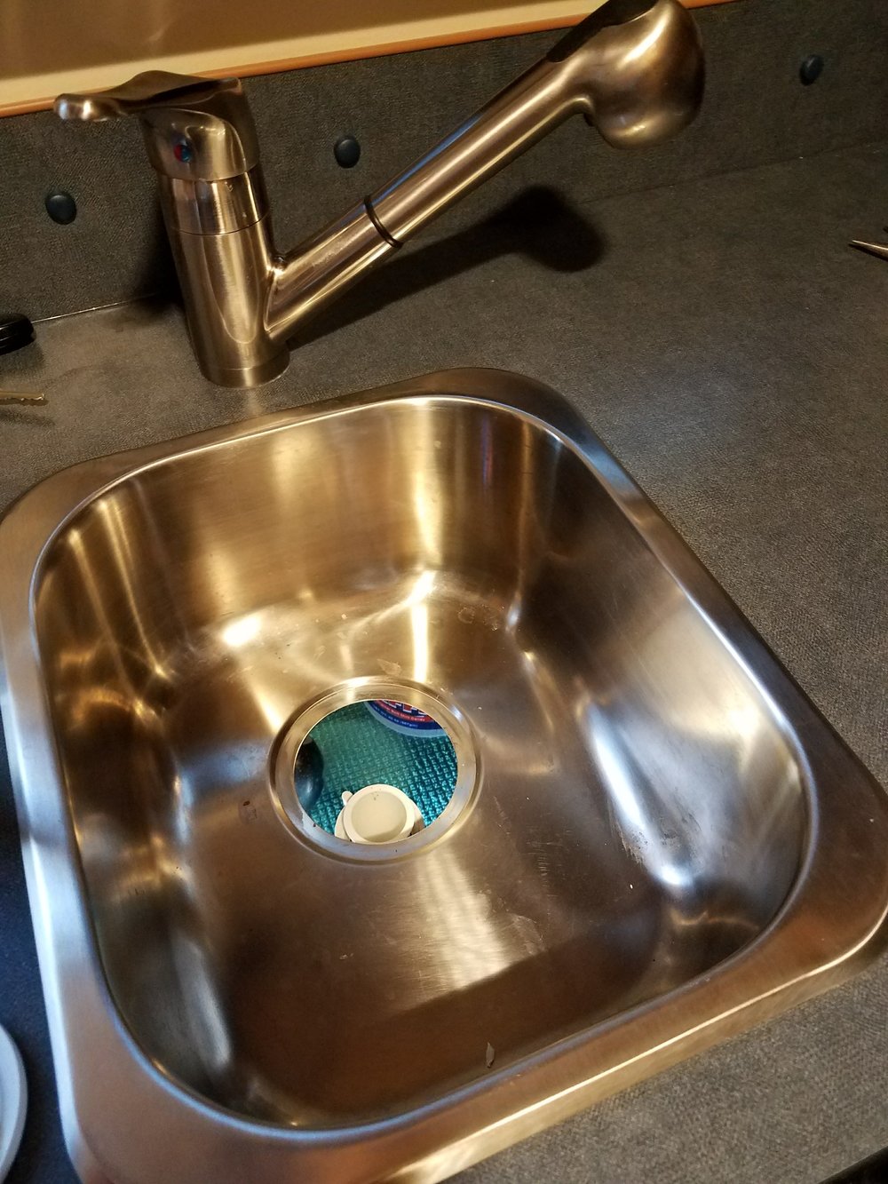 When my son Owen got home from work late in the afternoon, we went over to Wild Thing to repair the leaky sink basket. This issue showed up in my first few days on the road. After a consulting Escape Trailer, we determined that the production team had just started using silicone sealant instead of plumber’s putty to seal the sink basket. They had tested the seal during production by filling the sink with water and letting it sit for 3 hours and no leaks were evident. After the trailer had been bumping down the road for a few days however, the silicone sealant worked loose and proved to be inadequate for the job. They would have paid for me to take the trailer to a shop for this repair, but since it was a simple fix I wanted to try it on my own. I want to feel confident making simple repairs to the camper and this was a good place to start.