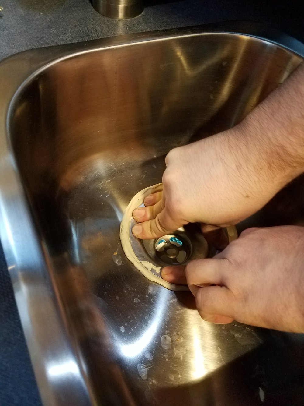 With the help of this YouTube video and my son, it was a quick and easy job to disassemble the sink basket and apply the plumbers putty to form a water tight seal. My To Do list is shrinking!