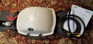 Next on today’s list was to assemble my Weber Q1200 Grill and retrofit it to use the propane quick connect built into Wild Thing. I have two 20# propane tanks in the camper and a built-in quick-connect port that allows external devices, like my new Weber Q1200 Grill, to connect directly and use this propane. The propane is regulated at the tank on the camper so the regulator that was built into the grill needed to be removed and replaced with a quick connect hose.
