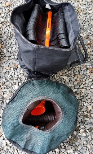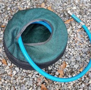 After doing a bit of online research I found the StorAHose bag from Stone Wolves and it looked like a good solution. The bags I ordered arrived while Wild Thing was in for service, so today was the first opportunity I’ve had to test them. I found them very easy to use and extremely effective. I used one for my 25-foot water hose and it worked like a charm. I tried the other on my Rhino Sewer Extension Hose. The bag was a little too large for the sewer extension hose so I’ll wash it with bleach to be sure it’s disinfected then use it for my 10′ water hose. The StorAHose bag is shaped like a donut with a hole on only one side. To use, you simply feed the hose it through the hole and it curls around itself nicely, pressing up against the outside edges of the bag and making a neat coil. I will try sewing a bag more appropriately sized for my sewer extension hose using a waterproof oilcloth fabric.