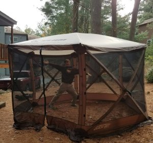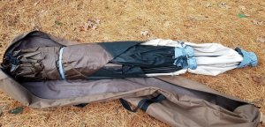 The day began as planned, Glen and I set up my new Clam Screen Shelter to be sure it worked as advertised. I ordered the Clam Quick Set Screen Shelter with the intention of using it as a mobile art studio where I can set up a sewing machine or an easel and spend the day creating while I’m on the road. A screen room could also be a good way to keep Dexter safe and contained while I’m creating and allow him room to roam. The Clam is a generous 140″ x 140″ and is lightweight (34 lbs). It folds and stores quite compactly and was easy to set up. Once out of the bag, the 5 sides of the shelter pop out with the tug of a strap on the center hub. Once the sides are out, a simple push up of the center hub pops the top into position. It was very fast to assemble and although Glen was helping me, I could have managed on my own. The only downside to this screen house is that even when disassembled, it is too long to fit in the cab of the truck and will need to be stored in the bed of the truck. When the camper is hitched to the truck bed, the Tonneau cover must be rolled up leaving the truck bed open. During those times, I’ll need to store it in the center aisle of the camper until I reach my destination and unhitch. I think it’s going to be worth the hassle to store. I’m very pleased with this screen house and I think it will work well as a mobile art studio!