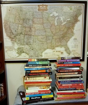 My process for deciding which books to bring works like this: First I make a pile of all the books I wish I could bring and realize it’s at least twice as large as what will fit in the camper. Next, visit the pile over the course of several days slowly whittling it down to a manageable size. I will place the books I’ve removed from my original pile in a box that my DH can ship if I get desperate!