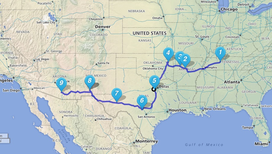 Friday, November 24 Leave Dickson, TN and head West on I40 through Memphis and Little Rock. I have two potential Wal Marts picked out for an overnight stop, the first about 340 miles from here and the other one a bit further along at 390 miles from my current location. If the winds and traffic are with me I will push on to the latter one which will put me in closer proximity to Sequoyah State Park in Hulbert, OK. I have a reservation there for Saturday, November 25 – Tuesday, November 28 and I’m looking forward to spending a few days visiting with the Jones Family (my DH’s sister Jane, her husband Richard, and their 5 children). Maybe it will be warm enough for me to finally get this camper de-winterized!