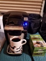 We’re both a bit tuckered out from the excitement of the holiday and our travels, so Dexter and I came back to the camper and lazed around enjoying a bit of a rest. I went out for groceries and supplies late in the afternoon but that was the sum total of my accomplishments for the day! I’m now enjoying a lovely cup of coffee made in the single-cup Keurig my DH gave me for Christmas. Am I spoiled or what?