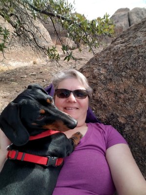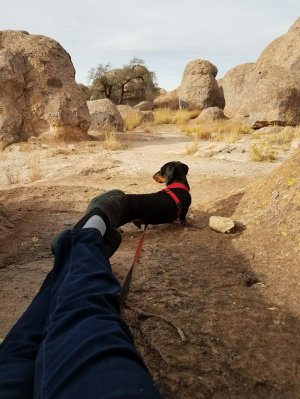 Arriving back at the campground about 2 in the afternoon, we unloaded the groceries and supplies and then took a nice walk up into the rocks. It was a warm day and I laid down on one of the rocks to take a nice Siesta while Dexter stood guard.