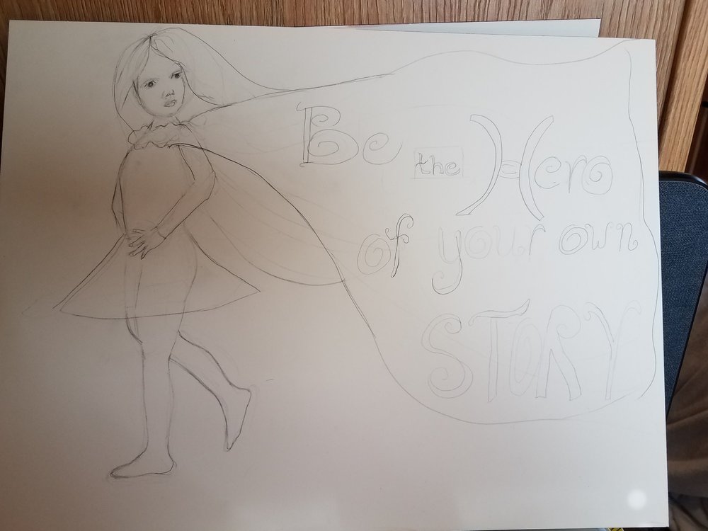 I’m reflecting this evening on how my artistic process parallels my life process. I had an idea of how I wanted this illustration to go… a Fairy Tale girl with a cape that reads “Be the Hero of Your Own Story”. I had a vision of the end result and I spent hours drawing, redrawing, erasing, drawing, erasing, and redrawing trying to get some approximation of the vision in my head. Illustrations as in life often take revisions and rarely turn out the way we originally envision. At some point, if we’re lucky though, we experience the peace of acceptance, and we step back to see that we have crafted something of value. We learn that things are never perfect, never our ideal, but we recognize that we have built something with character and love it because of its flaws not in spite of them.