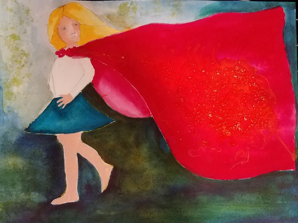 This process repeated itself as I began painting this illustration. I intended to keep her light and soft, but I guess she wanted to be fierce and strong. I was struggling with the background, then spilled the paint, and when I stopped to clean it up, things dried into a frozen mess of disjointed colors. Her cape became a hot mess, and all my beautiful gentle blues flowed into my yellows and mingle to make making the background green. I didn’t want green, but clearly the painting did, and I have to admit it works. How many times in my life have I stubbornly insisted that things go my way, and fight against alternatives? Most of the time, when things didn’t go my way, it was because there was a better option waiting for me if I could open to the possibility.