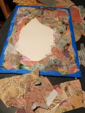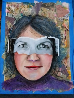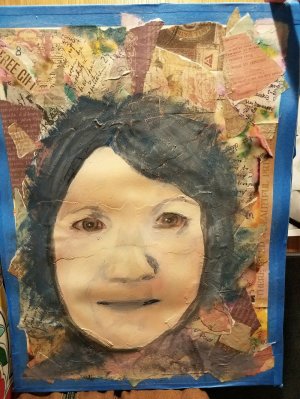 Step 3: tear out just the band across the eyes of the photo and collage that onto the background.