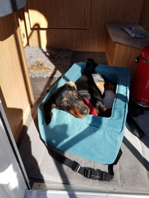 A few days ago I placed an internet order for Dexter from Chewy.com for food and a new car seat. The FEDEX guy delivered it right to my camper! This seat fits on the console between the truck seats. Dexter loved it so much he didn’t want to get out if it!