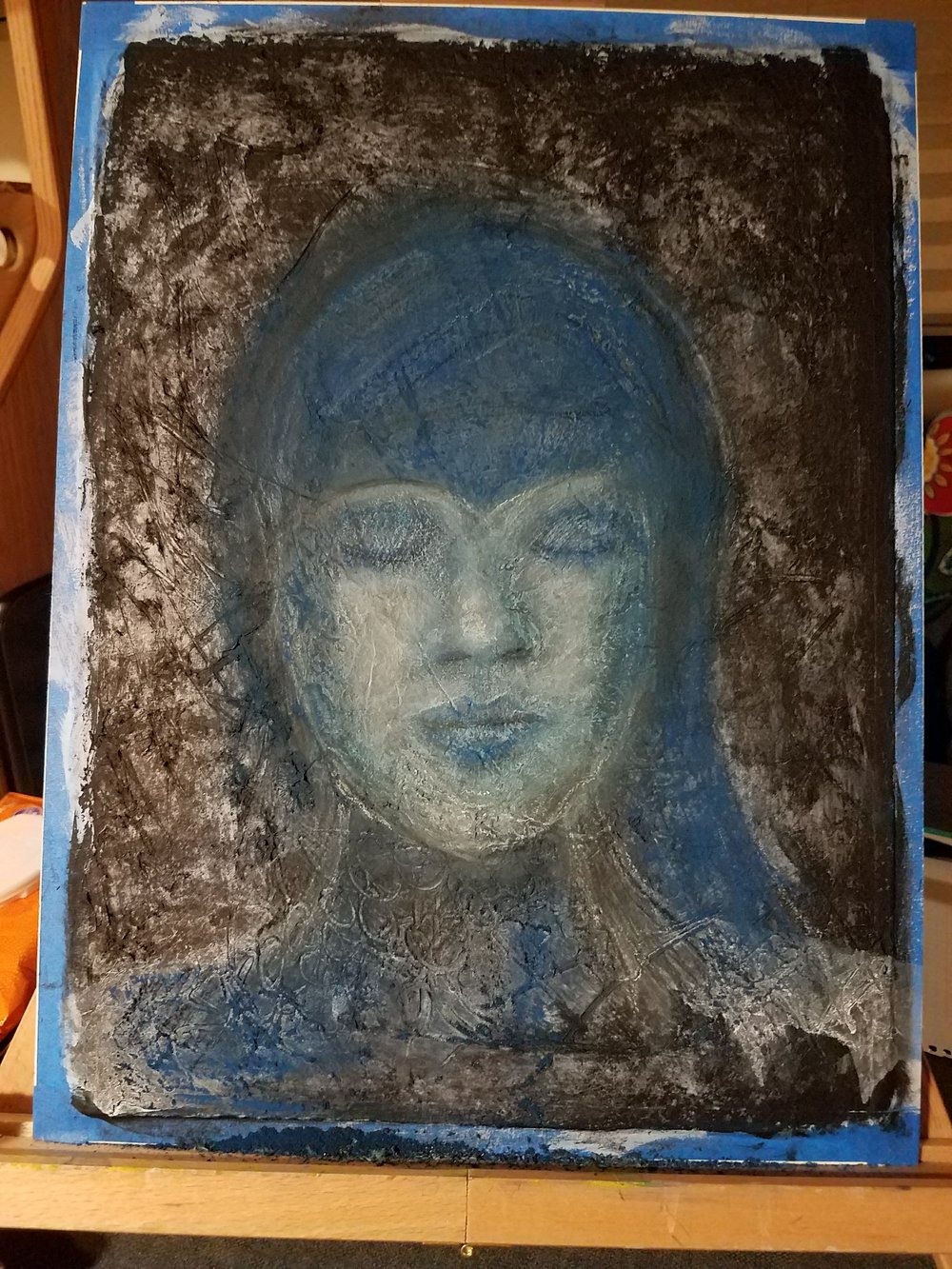 I spend some time this morning working on my next art lesson, this one from a teacher in the Netherlands, Juna Biagioni. I love trying all these different styles of painting and drawing. Each one teaches me something new. The internet makes it easy to take lessons from teachers all around the world. This one is still a work-in-progress. The technique uses a highly textured background made using extra heavy gel medium, a dark acrylic wash, and hard pastels. I didn’t have hard pastels, just soft pastels but I’m making do. It’s a messy job, but fun! She is just a girl from my imagination.