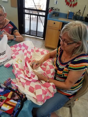I gathered with a group of fellow creative campers in the clubhouse of Rusty’s RV Ranch this morning to share some sewing time together. Several folks were working on repairing and restoring vintage quilts. Diane had admired my iron caddy last week, and thanks to the speed of the internet I was able to get the pattern for her quickly so she began working on it today! Peggy shared some lovely quilt pictures with me from a unique shop she had visited, and June (Rusty’s Mom) brought in a red and white vintage quilt started long ago by an Aunt in their family. She planned to make a tote bag out of it but her sewing machine was acting up. I have some experience with various sewing machines and was able to sort it out for her.