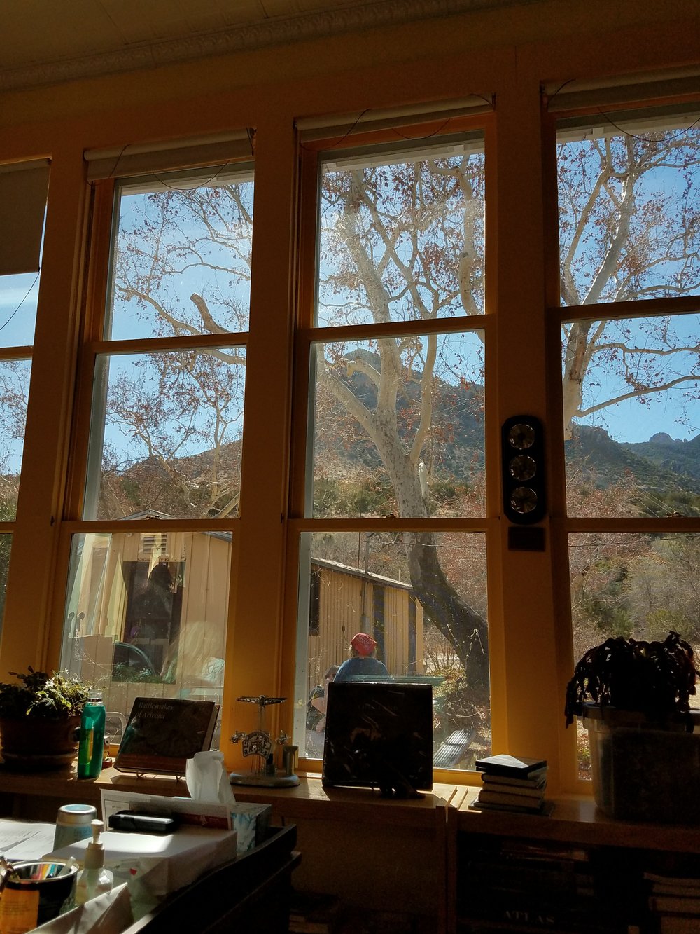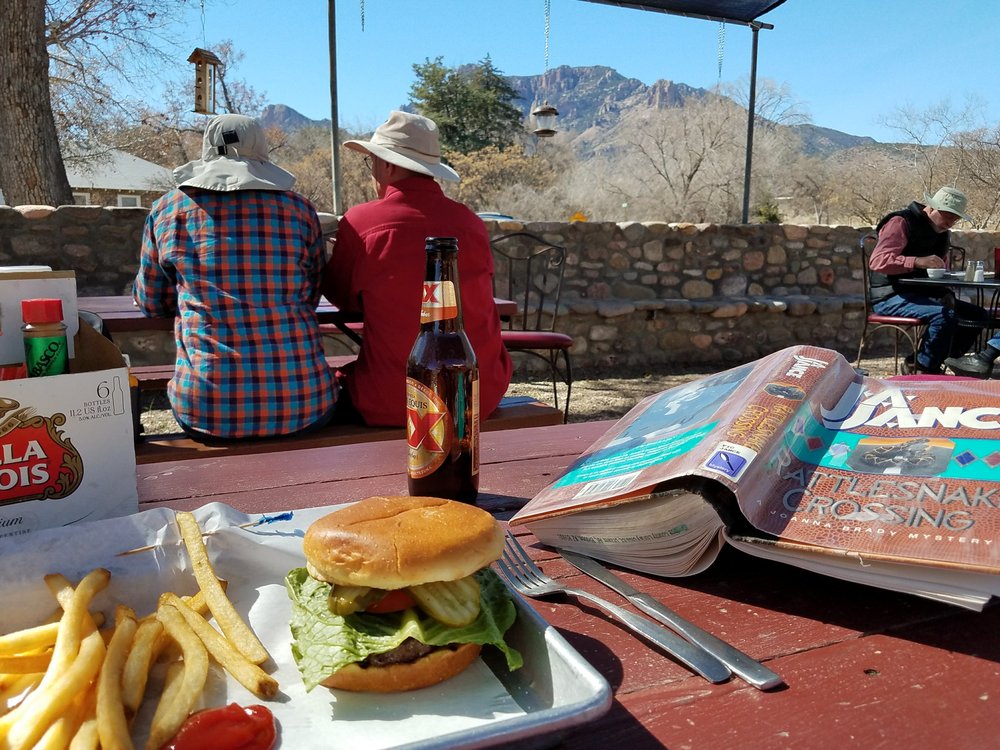 I enjoyed a quiet day today. Went to the Portal library and found it to have quite an extensive offering. I signed up for a library card and checked out a mystery by a local author then stopped for lunch at the portal Peak Lodge and Cafe. The burger was excellent! It was a lovely day to relax and read. Dexter and I had a nice long walk this afternoon and some playtime at the dog park with his ball then he was happy to nap while I went to the potluck dinner. Tonight was fried fish and I brought the famous Kings Inn tartar sauce. It was a hit!