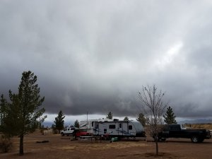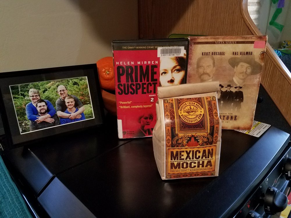 I’ve enjoyed a few hours this afternoon watching movies and sewing on the camper quilt. I finished watching the movie Tombstone, then started on the second season of Prime Suspect. I’m sipping a cup of coffee spiked with Mexican Mocha from The Bisbee Coffee Company. Their coffees are exceptional and this mocha treat is a delicious mixture of cinnamon, nutmeg, and chocolate. It’s a wonderful treat and chases away the chill in the damp 57 degree air.