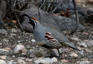 I finally found the house that welcomes birders and after parking and slipping through the gate I wandered down a path listening to the symphony of birds chirping in the surrounding brush to find myself at a lovely area with seating just in front of a large bird feeder. What a nice setup! I snapped away happily at these Gambles Quail for several minutes when in a whoosh, every bird took off all at once. There must have been something much scarier than I lurking in the brush! I hung out for a few minutes to see if they would return, checking behind me frequently for beady eyes but couldn’t see the cause of the exodus. After a short while, I decided to move along and check out another site on my list.