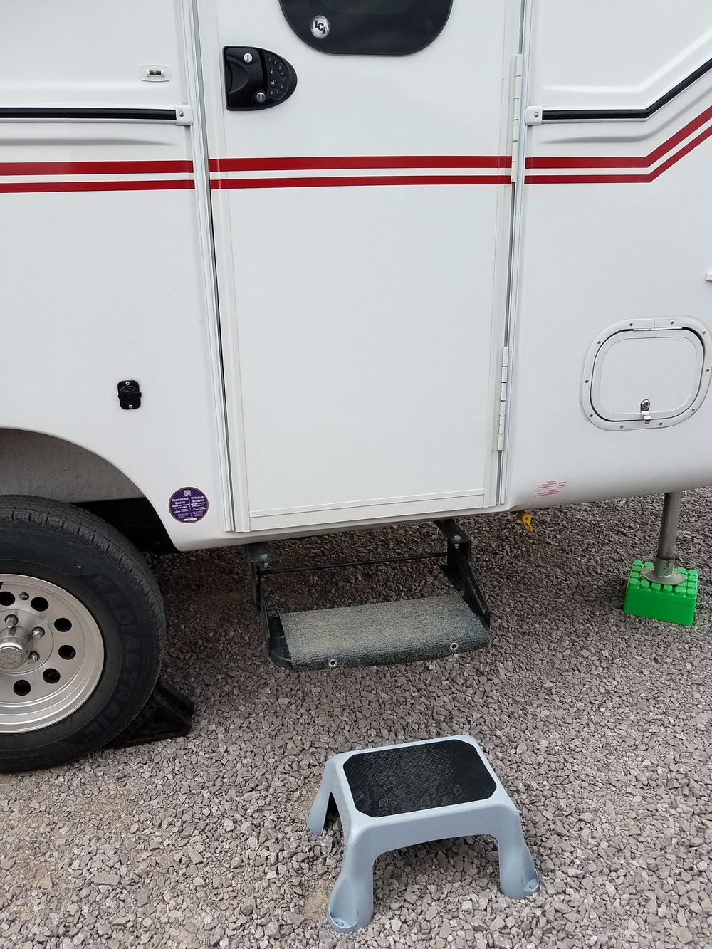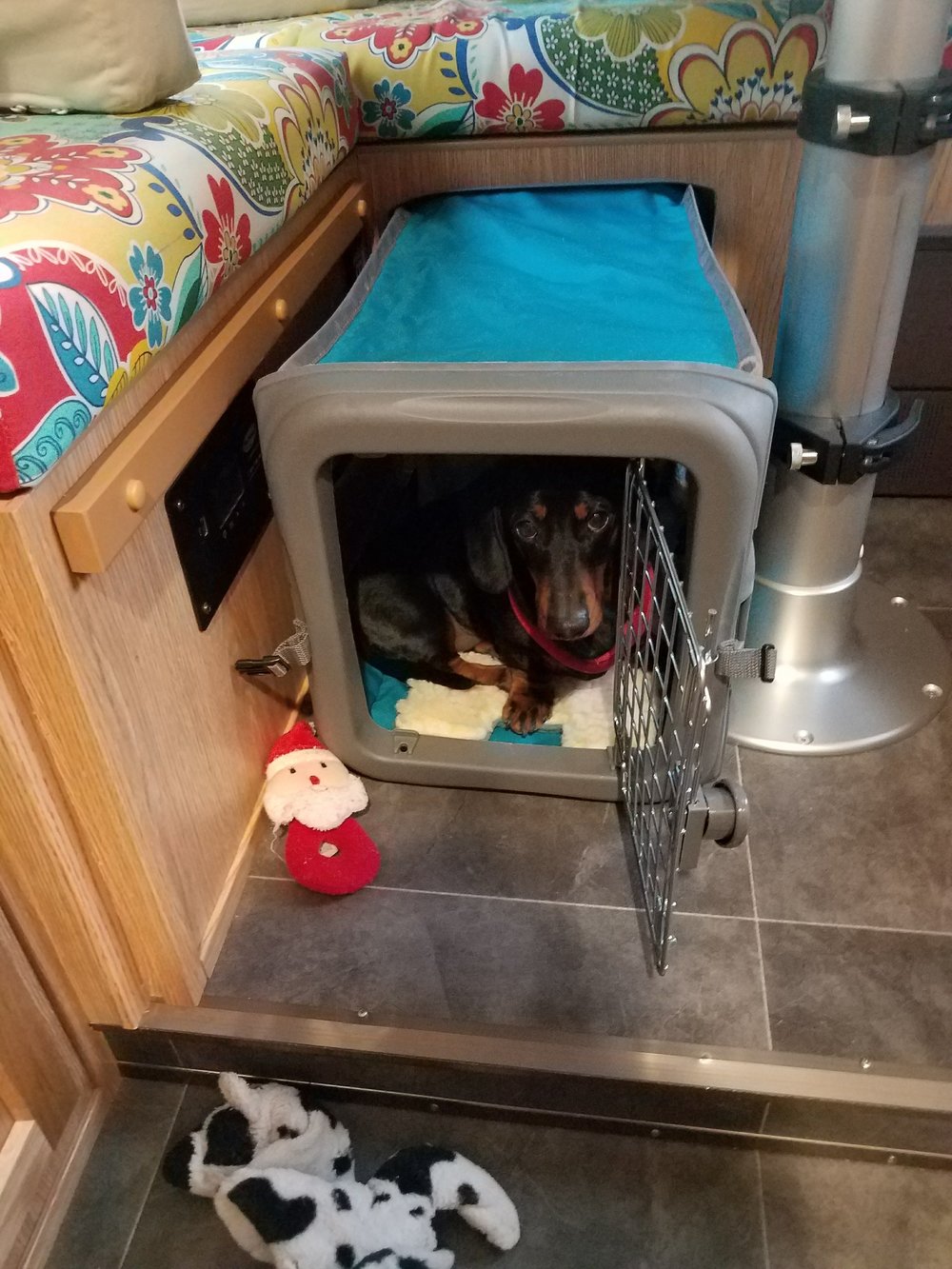 My last stop was Walmart. I needed a few groceries and a few items for the camper. I’ve been looking for a step stool to use in conjunction with the camper step and found one today. It’s a 15 inch drop from the camper step to the ground so this little step stool cuts that in half. Much more comfortable! I also found a new crate for Dexter. It’s smaller than the one I had and fits in the area under the table. It saves a lot of room! He seems happy with it!