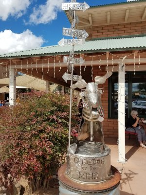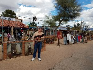 We sure packed a lot into the fantastic first day of Steve’s visit. Breakfast at the Greyhound room got us off to a good start and by the time we were finished with our meal and showers my permanent spot had opened up so we move the camper from the dry camping parking lot where we’ve been for the past two nights, to site number 37, my home for the next week. With much interest in help from our neighbors, we backed into this site without incident. The site is very level although we are a little close to our neighbors, everyone seems friendly, and we even have a nice little tree in our yard. The hookups were a little challenging with waters on one side, sewers on the opposite side, and electric directly behind. Fortunately, my cables and hoses were all long enough to reach. It was a beautiful sunny day so after a cool drink we jumped in the truck to explore the area a bit. We drove 7 miles down the highway to the wonderful artist community of Tubac and wander the galleries for a few hours. There’s a wide variety of art and we both enjoyed the afternoon there. Here’s just a sampling of what we saw: