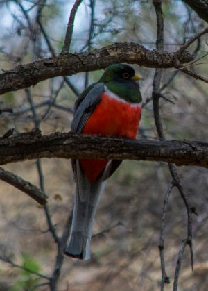 The Elegant Trogon is a 12″ tropical bird that ranges in the surrounding canyons and although we have heard there were sightings in the area it’s still pretty rare and exciting bird to see. We hiked all morning without success, heard of a few sightings but always seemed just too late to catch a glimpse of him. Then, just as we were giving up for the day and heading to the truck, we heard that he had been sighted again and this time we were rewarded for our efforts! I took many photos of this glorious bird and here are a few of my favorites. He was a spectacular sight as we followed him along the canyon for about 2 hours, traipsing through the brush, crisscrossing the stream and snagging ourselves on cactus trying to keep him in sight. He loved to tuck himself back in the trees, but did pose briefly a few times for us!
