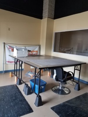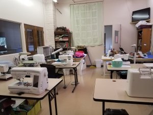 I see that they have the cutting table raised to a standing height. What a good idea. I like the whole room. The quilt is very eye catching!