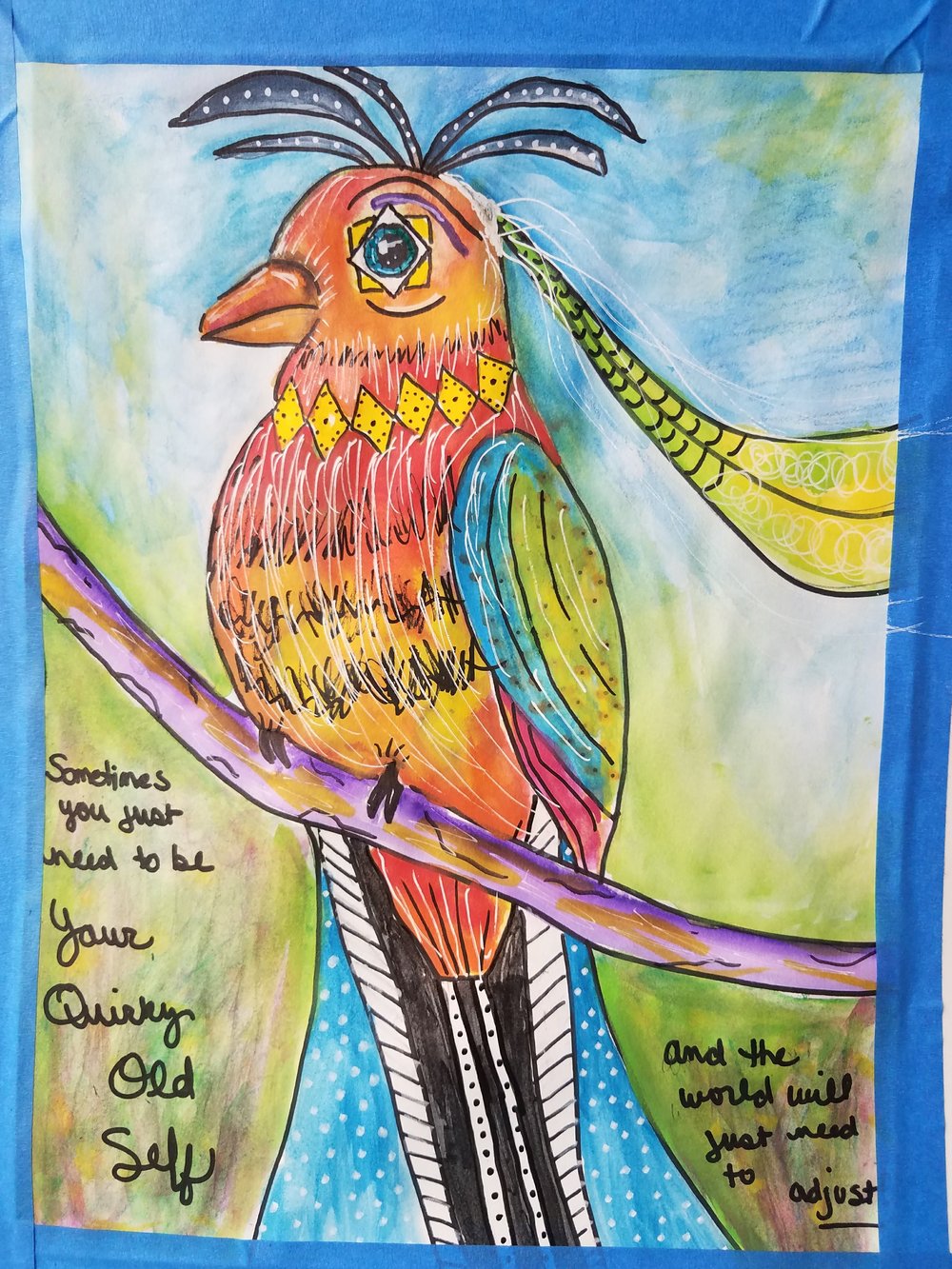 Not much happening today, I’ve been fighting a backache since yesterday and it’s no better today. Took it easy most of the day just trying to lay low until it passes, as it usually does. I did pop over to the art room and complete the next lesson in my online class called Quirky Bird! Just a fun piece that gave me a chance to play with some of the art materials I have and see how they react on the paper.